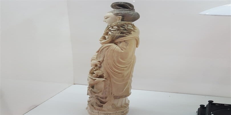 Chine début XXe : Sujet "Femme" ivoire travaillé portant idéogramme sur médaillon mobile sous la base, avec socle, hauteur 78cm. Fabriqué avant le 2 Mars 1947, conforme à l'arrêté du 4 Mai 2018.