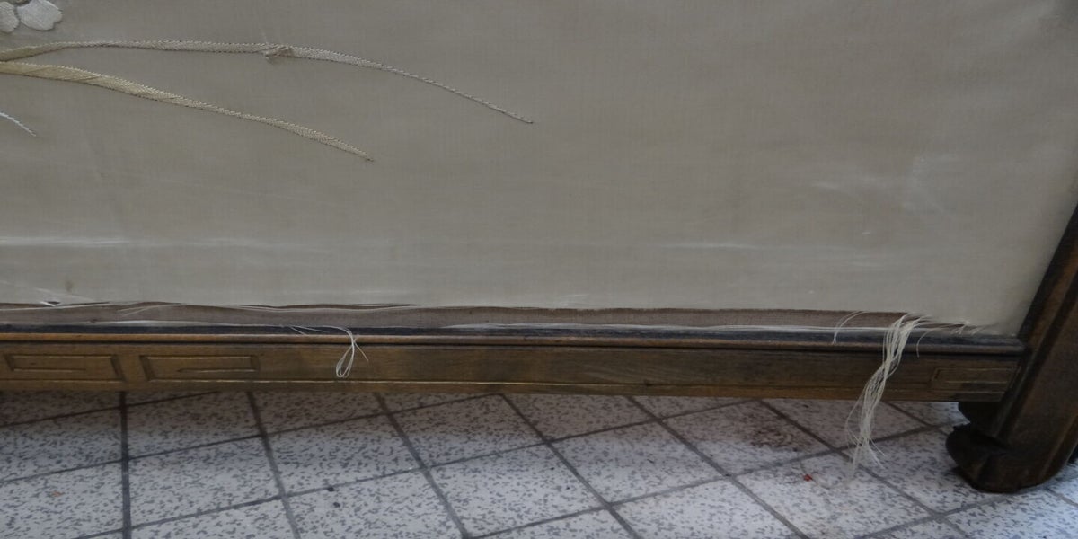 Chine : Paravent début XXe, à 4 pans orné de 4 tentures en broderie sur soie à décor de composition animale, végétale à décor aux oiseaux , entourage en bois naturel. H: 167cm X 272 déplié. (accidents).