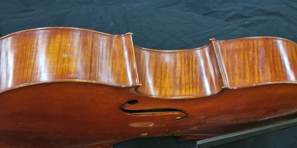 Interessant violoncelle français fait dans les années 30 dans le style de Vautrin, portant en intérieur étiquette Joseph Vautrin Fecit Chaumont anno 1930, contresigné J.Vautrin; 760 mm (caisse), une fissure sur l'eclisse , rayures, frottements