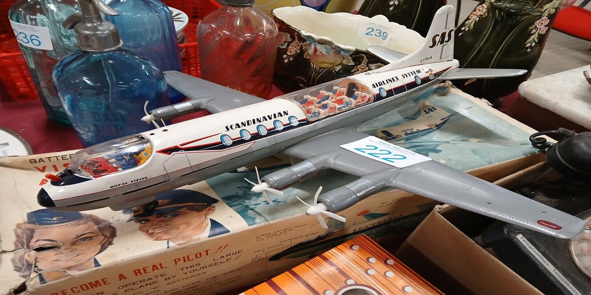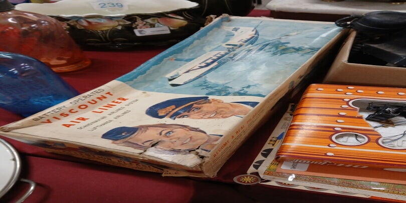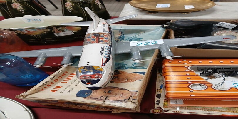 Jouet : avion de ligne LUFTHANSA fonctionnement à piles avec cockpit et cabine passagers transparents avec sa boite d'origine en mauvais état.
