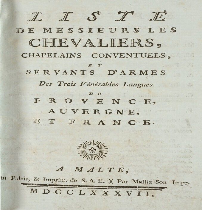 MALTE, au Palais et Impr. de S.A.E. par Mallia son impr., 1787, petit in 8 (184 pp - mal chiffré 481) sur papier bleu, tranches rouges. La première page est imprimée « Grand Maître Emmanuel de ROHAN, reçu dans la vénérable langue de France, né le 19 avril 1725, élu le 12