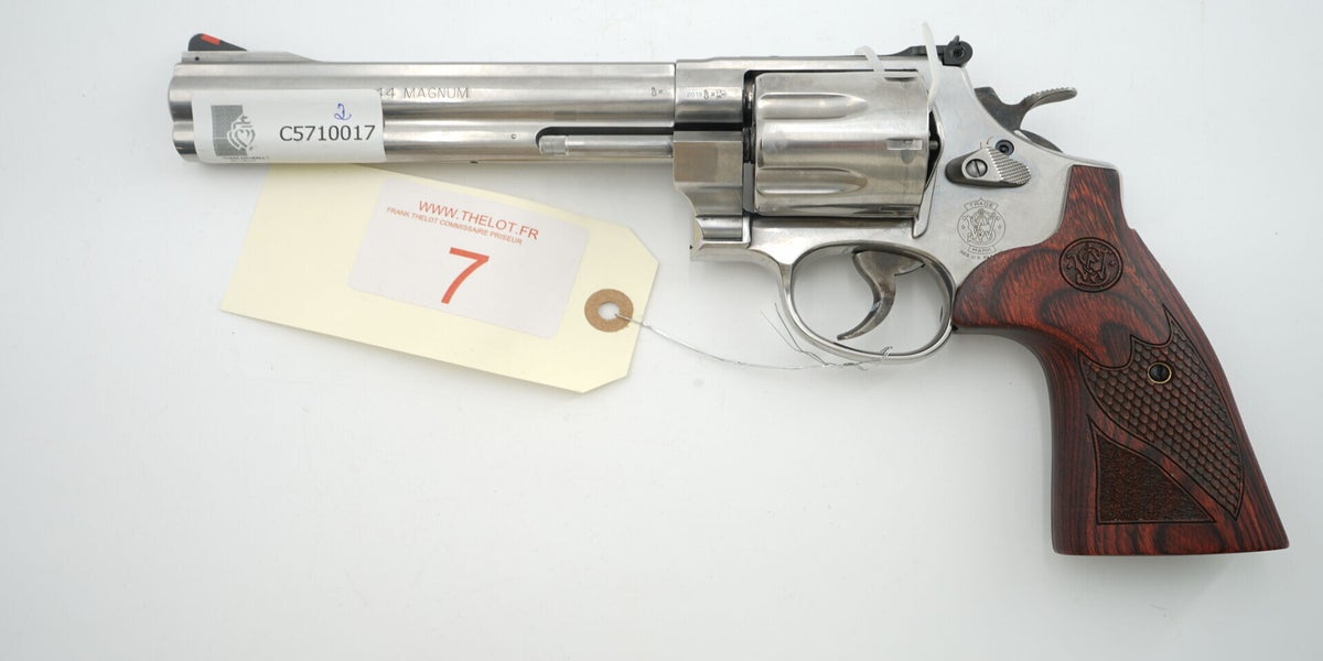 Revolver de marque Smith et Wesson, calibre 44 Rem Magnum, numéro de matricule DLB5959, modèle 629 classic, fait aux États Unis. Un coffret et des documents sont joints.