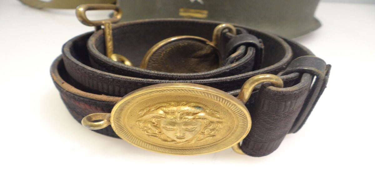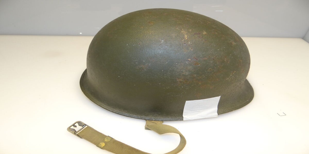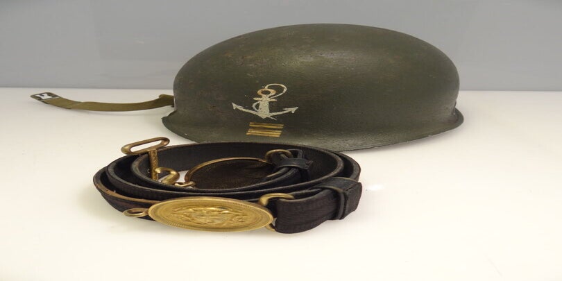Un casque américain avec son intérieur et une ceinture portée par le colonel P. Gauvin, à la Prise de Rastatt en Allemagne lors de la dernière Guerre 39-45