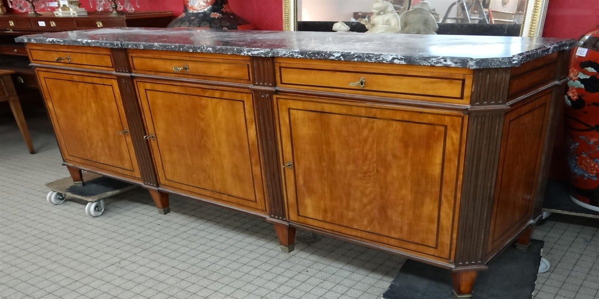 Enfilade Louis XVI, à trois portes et trois tiroirs, montants d'angle à pans coupés et tous montants cannelés, placage de citronnier et filets d'acajou sur bâtit chêne , 6 pieds fuseaux à sabot laiton, plateau de marbre brèche gris et blanc, travail typique de l'île de Ré, époque XVIIIe, largeur 201cm, profondeur 54cm