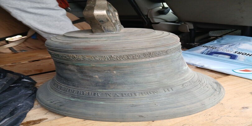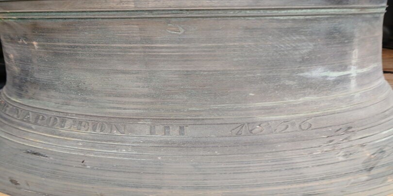 Importante cloche d'Eglise en bronze ornementée d'une frise végétale et d'un calvaire sur le flanc, marquée sur le pourtour "Auguste Hildebrand à Paris, Fondeur D M L Empereur Napoléon III 1856" (Sans le battant) (H : 53 cm environ)
